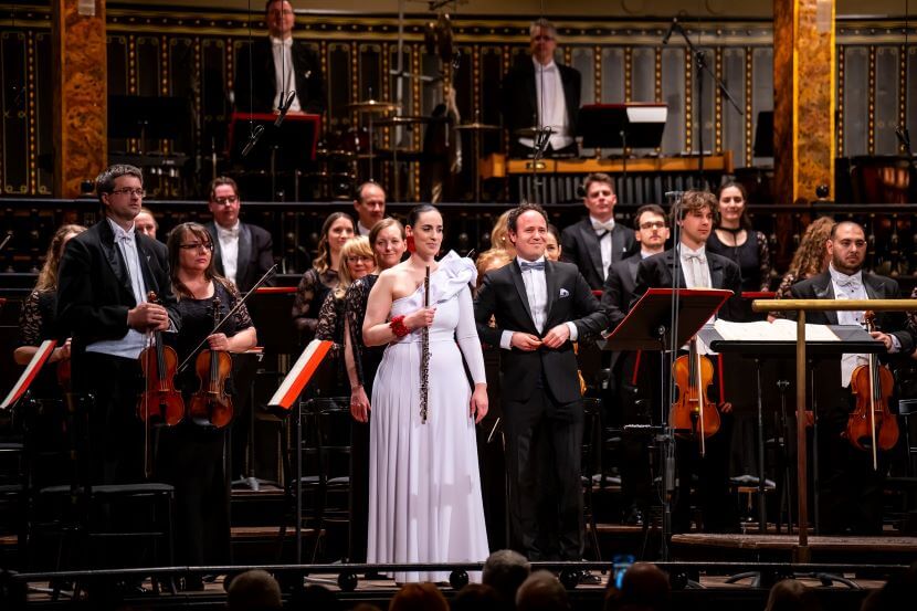 Öt hét elteltével, március 19-én ismét figyelemreméltó vállalkozásnak lehettünk tanúi, amelynek azt a címet is adhatnánk, hogy főszerepben a fuvolák. Az Egy faun délutánja című népszerű Debussy-művet követően angol zenét hallhattunk, Christian Mason és Edward Elgar műveit. Ezúttal Madaras Gergely volt a karmester, aki nemzetközi pályáját az Angol Nemzeti Opera asszisztens-karmestereként kezdte, és 2019 óta a Liège-i Királyi Filharmonikus Zenekar zeneigazgatója. Ez utóbbi minőségében vehetett részt a vele egy évben (1984-ben) született Mason első versenyműve ősbemutatójának előkészítésében. A kompozíció Győri Noéminek a felkérésére készült, az ő nevéhez fűződik a 2024-es ősbemutató is. A művészházaspár személyes kötődése hatásosan készítette elő e kompozíció kedvező fogadtatását (mind a zenekar, mind a közönség részéről). A Thaleia című fuvolaverseny szólistája két hangszeren (fuvola, piccolo) felváltva játszik, különleges játékmóddal néha egzotikus hangokat is elővarázsolva a hangszerekből, ráadásul a zenekar három fuvolásának is igényes játszanivalóval kell társulnia a szólistához. S miközben hangszín-varázst élvezhet a hallgatóság, a szólista komoly megmérettetésnek tesz eleget – s közben rövid időre concertáló szólista-partnerekké előlépett zenekari játékosokkal (elsősorban brácsa, hárfa, nagybőgő) kamaramuzsikusi érzékenységéről is számot kell adnia. A háromtételes versenymű zárótételében a hangszeresekre vokális feladat is vár! Fantázia-mozgató hangszínvilág köti le a közönség figyelmét e kompozícióban, amelynek ideális hangulati előkészítője volt a Debussy-mű. A műsor második része Elgar zenei világába kalauzolt, az Enigma-variációkkal és induló-sorozatának (Pomp and Circumstance) egy tételével.